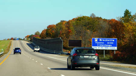 Brockville, Canada - October 28, 2019 - The view of the traffic on Route 401 highway overlooking the sunning colors of fall foliage