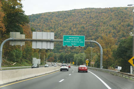 Poconos, Pennsylvania, U.S.A - October 23, 2021 - The view the traffic on Interstate 80 towards Delaware Water Gap overlooking fall foliage on the mountain