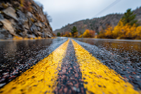 A stunning close-up of yellow road markings on wet asphalt, with a dramatic interplay of light showcasing the texture and ambience of the surrounding nature scene.
