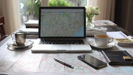 A top-down view captures the exciting moment of planning a new adventure. A detailed paper map is spread out, surrounded by modern technology like a laptop and tablet, alongside a traditional compass.