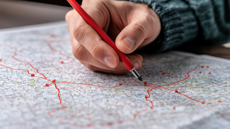 A person is drawing on a map with a red pencil. The map is a road map and the person is marking a route