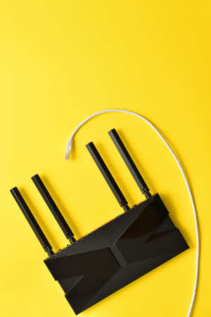 cable for internet connection. wifi router and internet cables on a yellow background. 3d rendering.