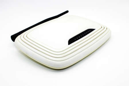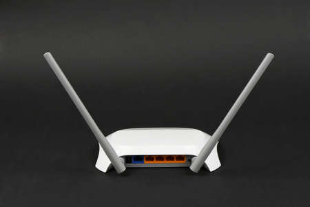 White WIFI router with two antennas isolated on black background, Clipping path inside. High resolution photo. Full depth of field.