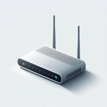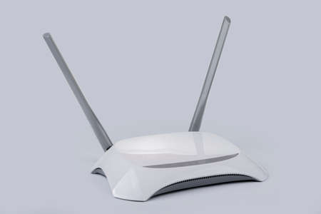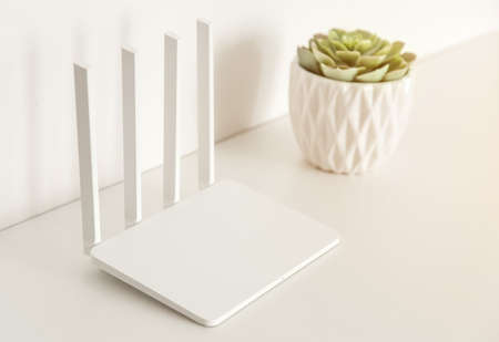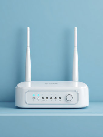 A close-up studio shot presents a white router with two antennas. It is positioned on a plain white surface. The router features blue indicator lights. The lighting is soft, creating gentle shadows. Suitable for use in technology articles, advertisements, or web design projects.