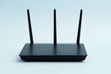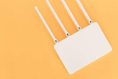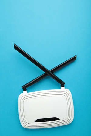 White wifi router with black antennas on blue background with copy space. Minimalism. Top view