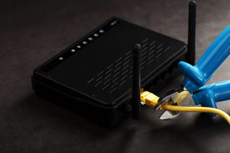 Tearing and cutting with blue wire cutters the network connection of the yellow wire of the Internet connection. Disabling and restricting Internet access