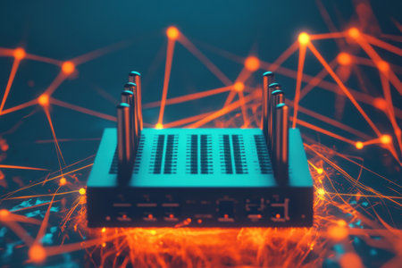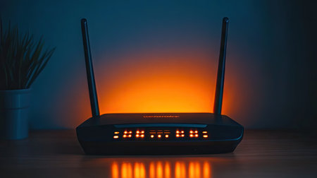 A router is illuminated by abstract glowing lines and network cables, showcasing a dynamic technology atmosphere at twilight.