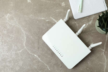 A wireless router with glowing indicators on a desk, with a simple backdrop providing room for text.