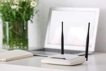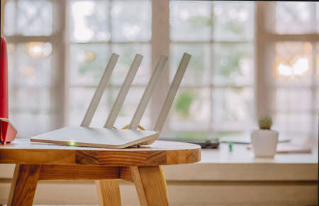Modern black router with two antennas is standing on a wooden desk in a home office, ready to provide fast and reliable internet connectivity
