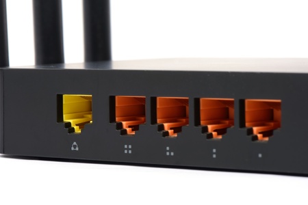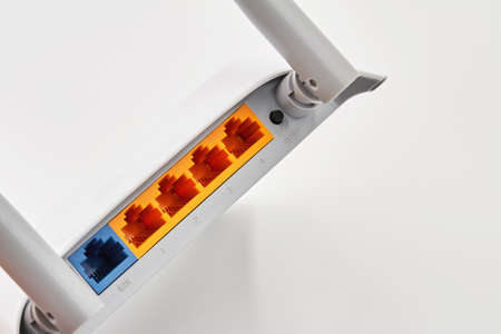 Wireless internet router with connected cables, The backside of fiber optic internet, and network cables connected to a router. Internet security and hi-speed concept. Selective focus.. Close-up