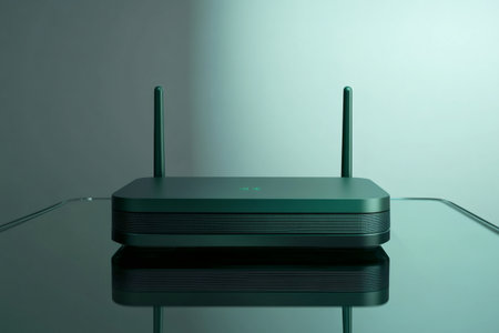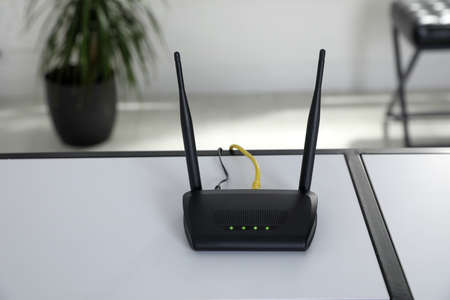 Stylish green router with two antennas is placed on glass table and providing fast and reliable internet connection