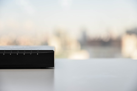 closeup of a wireless router and a young man using a smartphone on living room at home with a window in the background