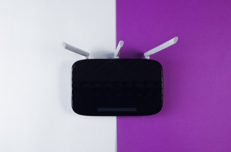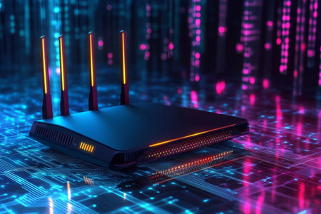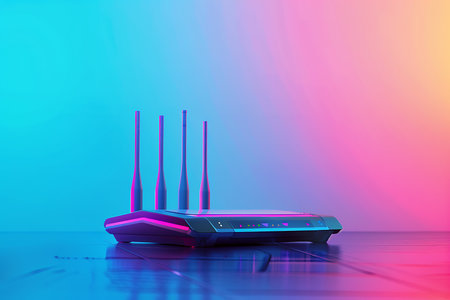 Captivating close-up showcases a sleek, modern Wi-Fi router with four antennas, reflecting on a surface bathed in vibrant neon hues of pink, purple, and blue light.