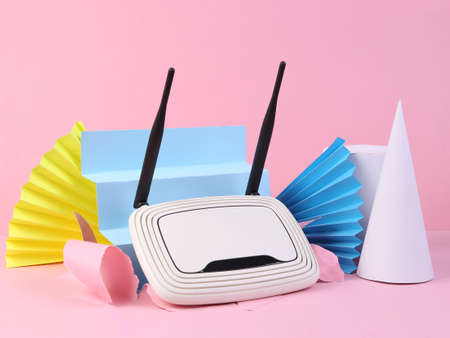 beauty product. Wifi router on pink torn background with geometric shapes. minmalism. concept art