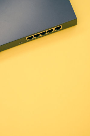 Multiple LAN switch router RJ-45 Ethernet ports internet connection sockets object detail, extreme closeup, nobody, no people. Local area network switch ports macro, networking, cyber security concept