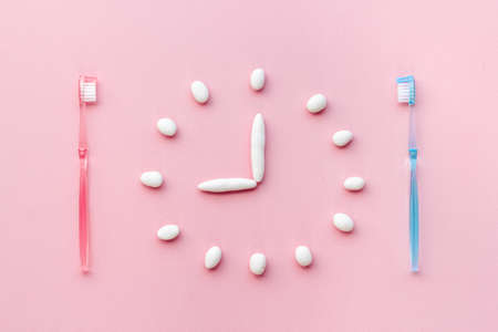 Clock made of toothpaste with toothbrushes. Oral care and dental hygiene concept