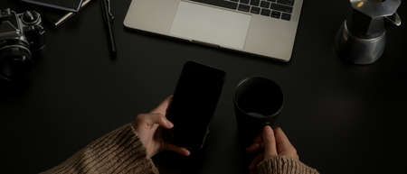 Overhead shot of female hands using smartphone and holding coffee cup on dark office desk with supplies