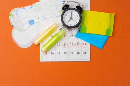 Menstruation calendar with sanitary pads and tampons, pills