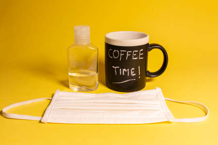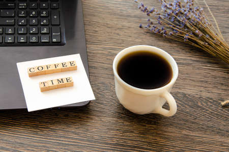 a cup of coffee near the computer and a bouquet of lavender, the inscription coffee time. High quality photo