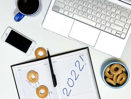 Layout of office items. On the notebook is the inscription 2022. The concept of the New Year.