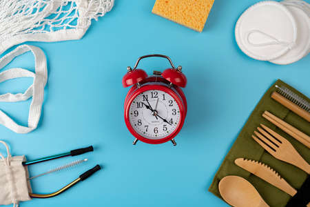Plastic free set with cotton bag, metal straws and recycled tableware top view. Zero waste, eco friendly concept with clock alarm. time to be careful concept