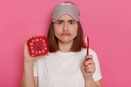 Portrait of sad upset funny woman with blindfold holding red alarm clock and tooth brush, dont like cleaning teeth, looking at camera with with pout lips, time for morning procedures.