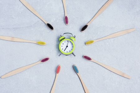 Alarm clock and bamboo toothbrushes on stone background.