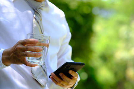Businessman holding a glass of water and using a mobile phone.