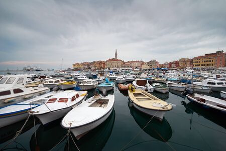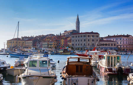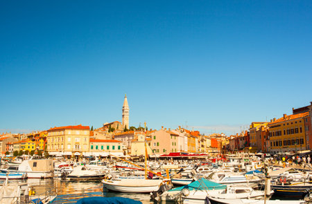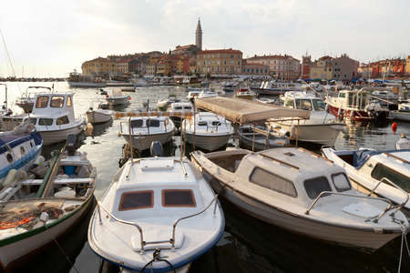 Rovinj, Croatia. Motorboats and boats on water in port of Rovinj. Medieval vintage houses of old town. Yachts landing, tower with clock on the background.