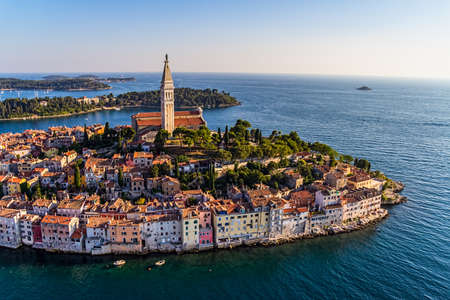 Aerial view to Rovinj old town, popular travel destination in Istria, Croatia.