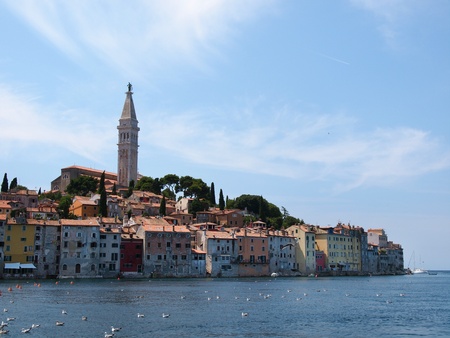 The historic part of Rovinj in Croatia with the Church of Saint Euphemia and the sea.