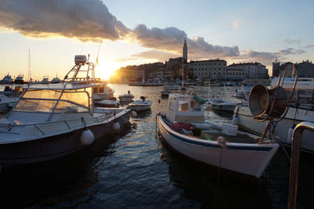 ROVINJ, CROATIA - SEPTEMBER 24, 2011: Sunset in the old mediterranean town Rovinj. Rovinj is located on the western coast of Istrian peninsula and is popular tourist resort and active fishing port.