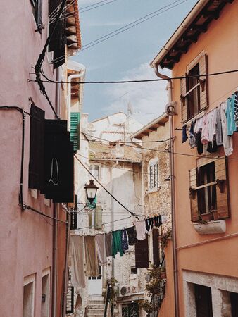 2019, Europe, Croatia, Rovinj. Architecture of old town of Rovinj with clotheslines across the street. Travel, adventure concept. Old city background.