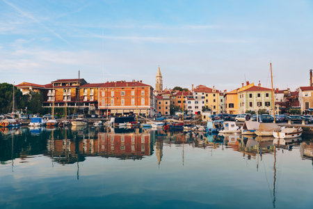 Harborfront Panorama of Izola with Reflections of Boats and Historic Architecture