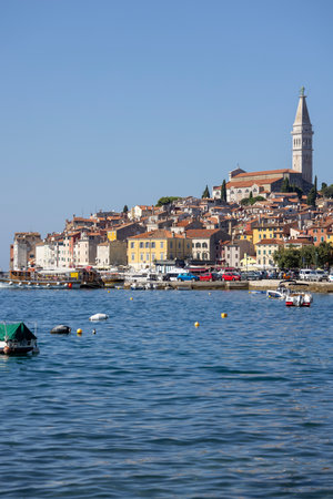 Rovinj, Croatia, Istria - September 29, 2023: Beautiful view from the South port Rovinj over Adriatic Sea to the peninsula with the Old Town and the tower of Saint Euphemia Church