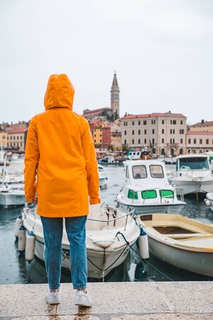 woman in yellow raincoat at rainy weather looking on rovinj city. copy space