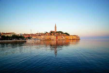 View to the historic center of Rovinj during sunset with water reflections in summer