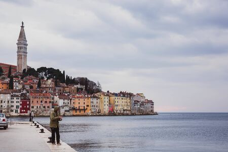 CROATIA, ROVINJ - March 29, 2018, Man fishing by the sea near colorful old town Rovinj, Istria, Croatia