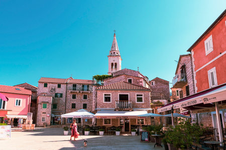 Jelsa Croatia - 17 August 2020: The center of Jelsa town with walking people, Hvar island.