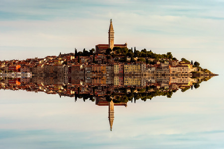 Abstract skiline of the old town of Rovinj, Istria, Croatia mirroring in the sea water. Rovinj city in the mirror