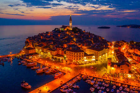 Beautiful Rovinj at sunset. Evening aerial photo of the old town of Rovinj with church of St. Euphemia, Istria, Croatia.