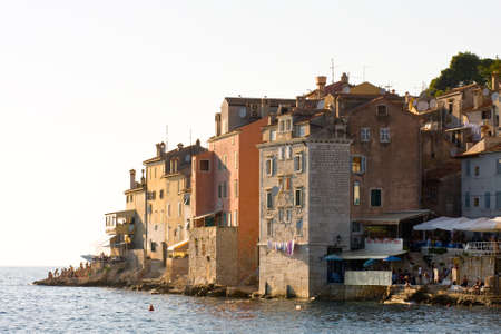 View of the typical croatian old houses in the coastline of the old town of Rovinj, Croatia, just on the Adriatic Sea, during the sunset