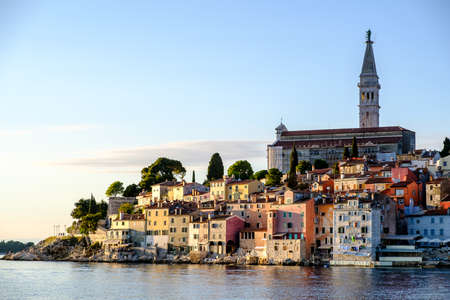 The historic part of Rovinj in the sunset. Above roofs of houses rises Monastery of St Francis.