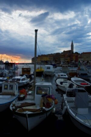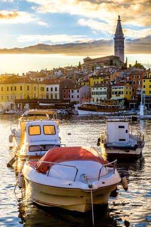 view of beautiful old city Rovinj in Croatia on sunset boats in bay