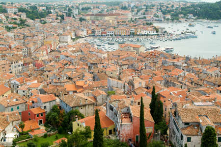 Rovinj rooftops and harbor aerial view, Istria region of Croatia