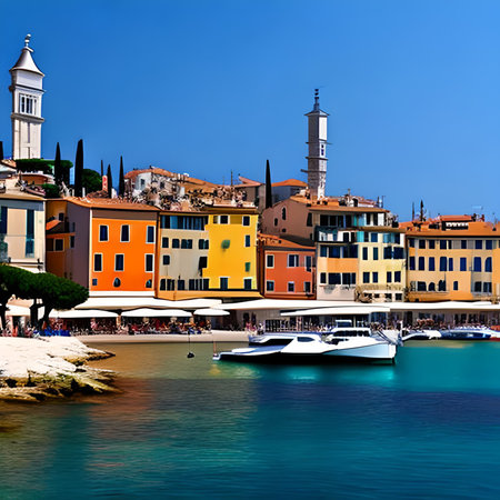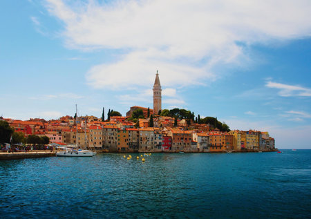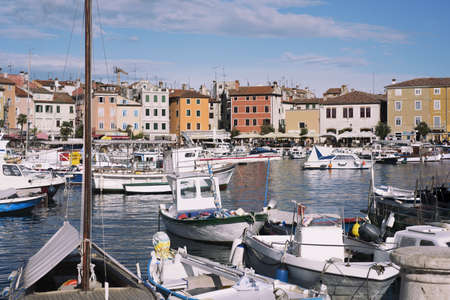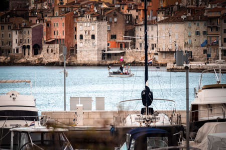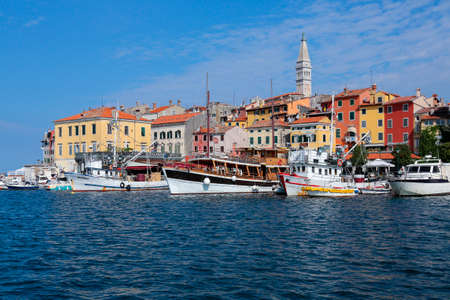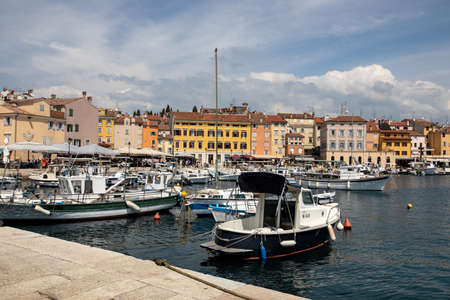 Rovinj, Croatia - July 17 2018: View of colorful old town and picturesque harbour of Rovinj, Istrian Peninsula. The town is a popular tourist destination in summer