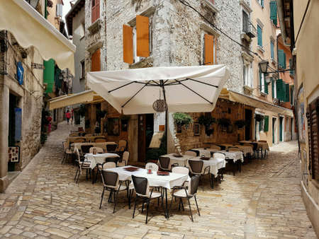 Cafe terrace in ancient town Rovinj, Croatia Europe