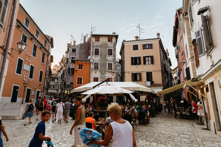 Rovinj, Croatia - July, 2016 - People walk in the center of the historic town of Rovinj, Croatia.