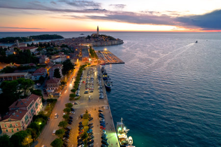 Town of Rovinj historic peninula aerial dusk view, Istria region of Croatia