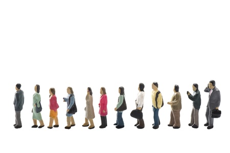 Miniature people standing in line over white background.